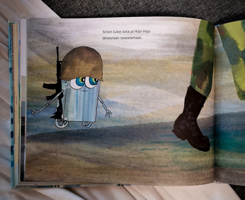 Myönnän että minulla oli vahvat ennakko-oletukset, mutta pienille suunnattuna lastenkirjana en pitänyt tästä. Eniten mietin niitä kummeja ja isovanhempia, jotka ovat kääräisseet tämän palkintojen siivittämänä pakettiin pahaa-aavistamattomalle päiväkoti-ikäiselle. Kuvitustyylikään ei ollut aivan minun makuuni, vaikka Hopi onkin Wall-E-tyylinen symppis hahmo.